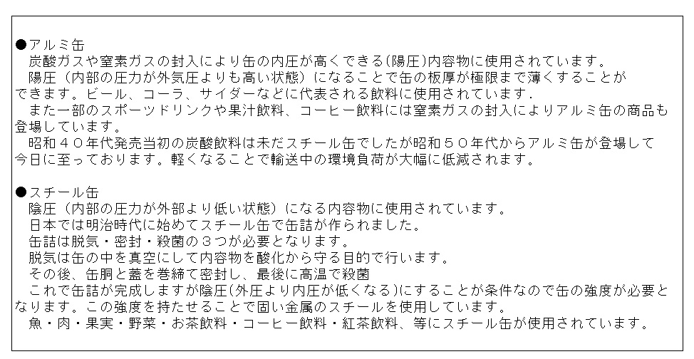 中身の性状や処理方法により強度が必要な場合は、丈夫な鉄(スチール缶)を使用しているのですね。